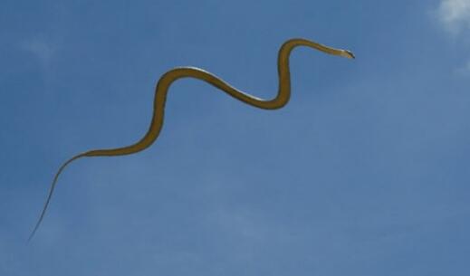 堂树蛇,属于游蛇科的一种蛇类,其主要栖息在南亚以及东南亚雨林的树上,天堂树蛇有一个技能,那就是会“飞”,它能在树木之间进行“飞翔”,距离可达100多米。