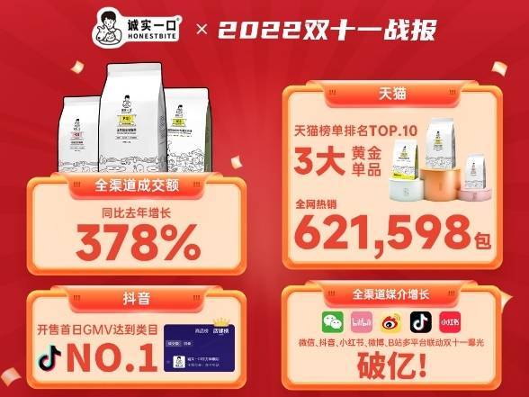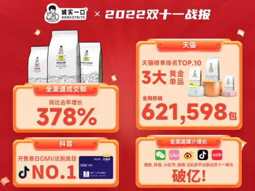随着Z世代加入养宠大军,“云吸猫““精神养狗人”等词爆红网络,包括宠粮在内的相关行业更是呈现热度爆发。双11收官,从各大平台最新发布的2022年双十一宠物品类销售战报来看,诚实一口作为近年国产宠粮的黑马