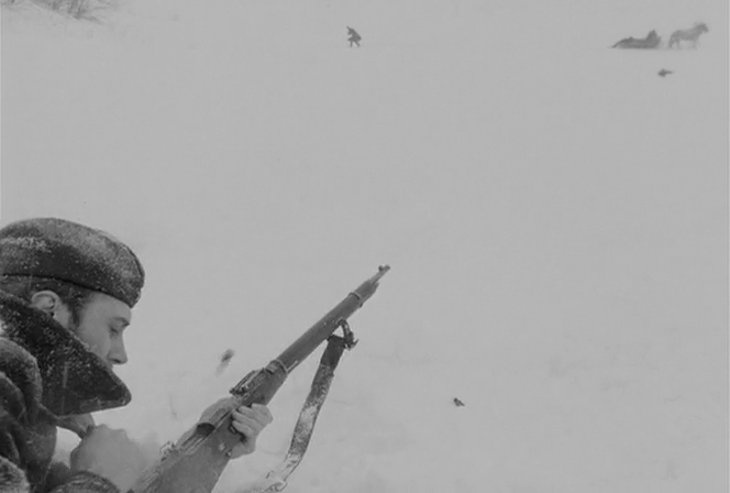 俄国战争期间,一支红军游击队遭到德国军队伏击,被困山林。游击队员索特尼科夫(Boris Plotnikov 饰)和雷巴克(Vladimir Gostyukhin 饰)奉命离开部队,寻找补给。两人穿过茫茫雪原,在某个信奉基督的村长(Sergei Yakovlev 饰)家中寻得一头羊。返回途中却因迷路与一小股德国士兵遭遇,枪战中索特尼科夫负伤,两人奋力逃脱,躲进一户人家。不久后三个白匪不期而至,并发现他们的行踪。