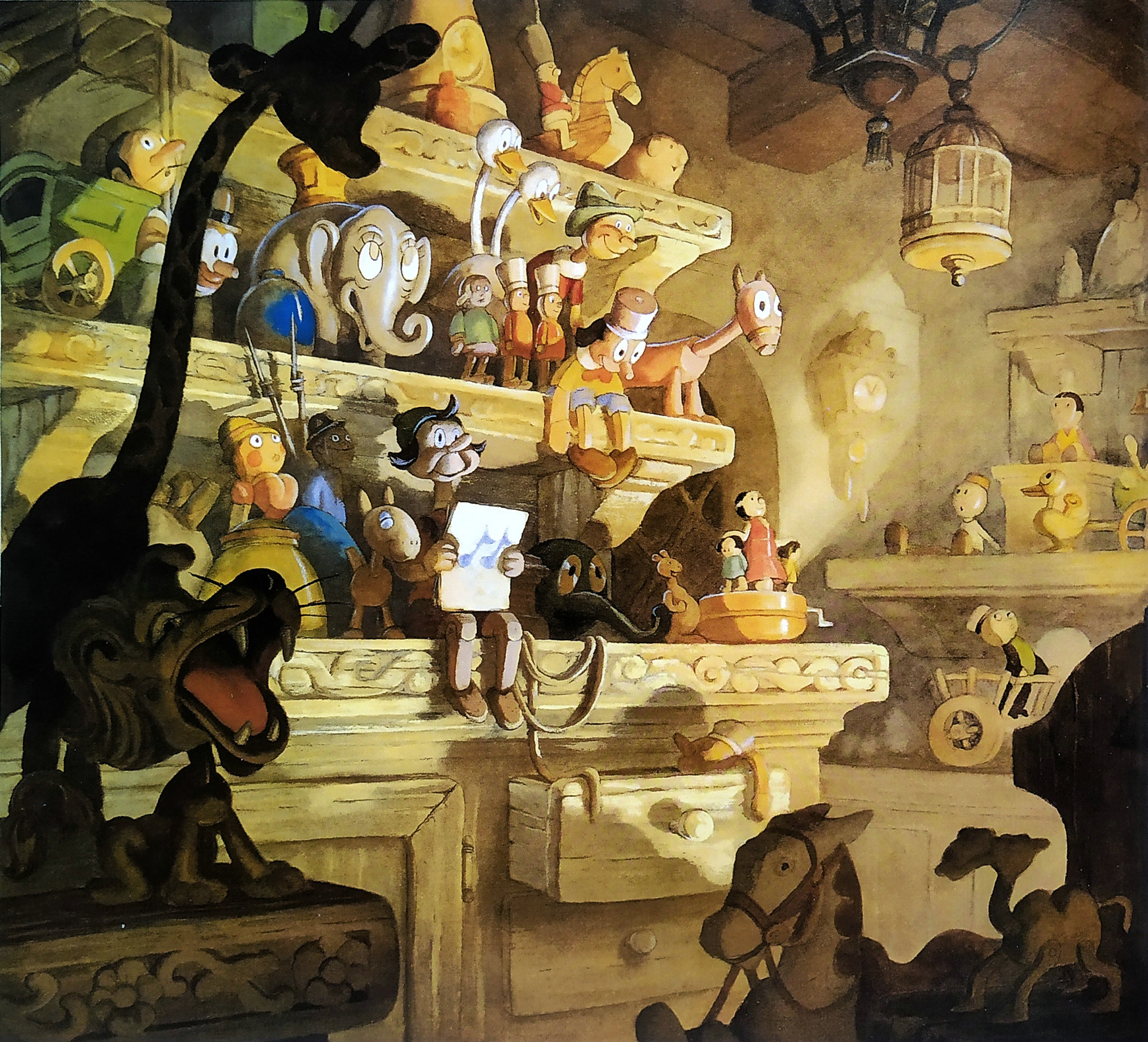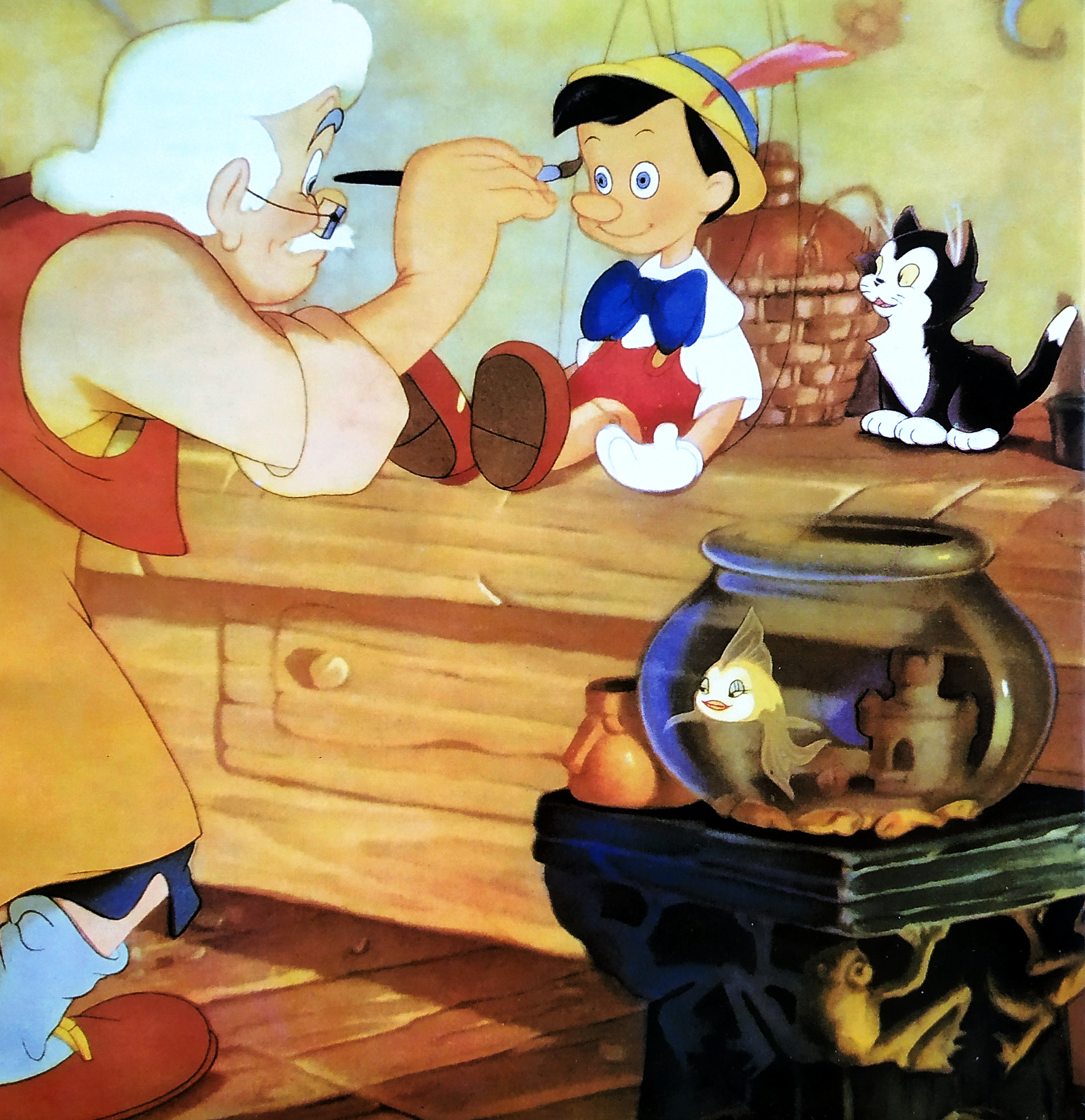 孤独的木匠爷爷这晚亲手制作了一个木偶男孩——皮诺曹。可能上天眷顾爷爷,午夜,蓝仙女显灵了,她让这个木偶男孩具有了意识,能像其他男孩那样跑跑跳跳了。获得了生命的皮诺曹兴奋不已,很快和屋子里的小动物交上了朋友。早上爷爷起来见到皮诺曹惊讶不已,他十分感激上天赐给他的礼物。