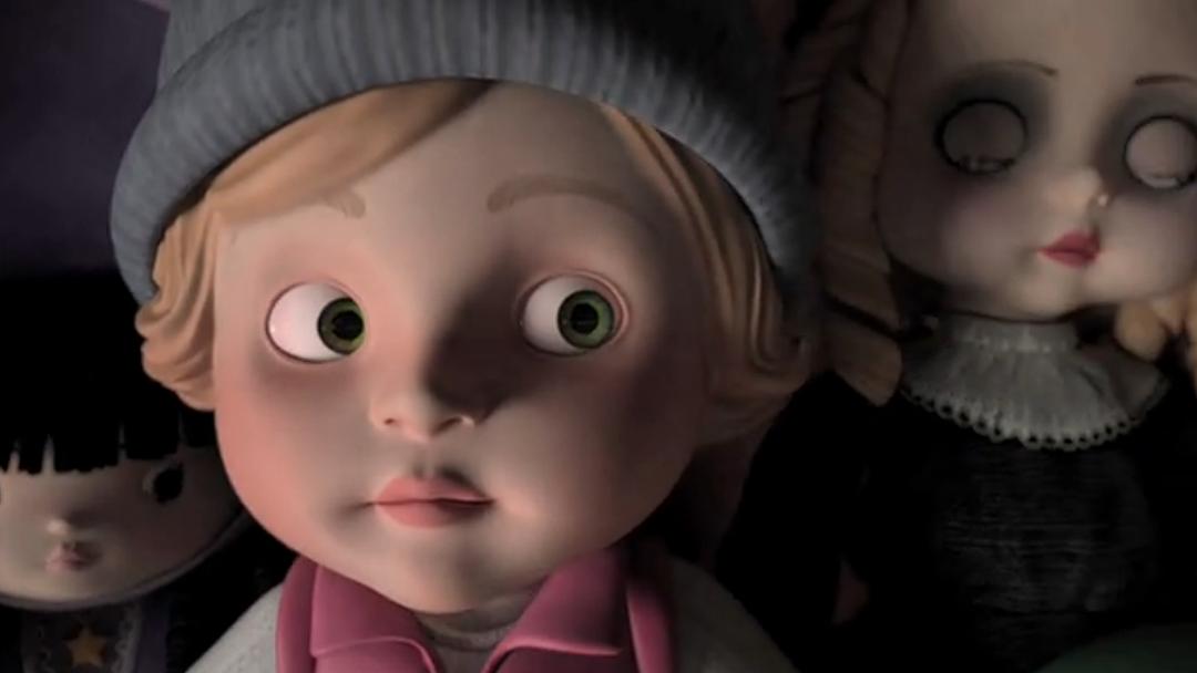 雪花纷纷飘落,古朴的西欧小镇银装素裹。戴着蓝色帽子、身穿粉红色坎肩的小女孩蹦蹦跳跳穿梭于街道之中,并在墙上写下了她的名字。偶然机会,她在一家玩具店的橱窗前看到一个玩偶,玩偶的穿着打扮竟与小女孩一模一样。有如鬼使神差一般,小女孩走入这间阴森寒冷且空无一人的玩具店。这里摆满了各式各样的娃娃,似乎所有的娃娃都有生命一般,眼球仿佛总在四下转动。小女孩只顾寻找那个和她长相一样的娃娃,却不知危险正渐渐逼近……