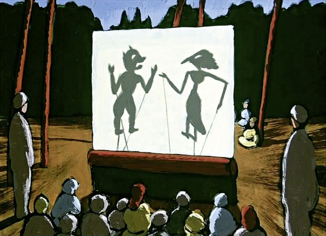 男人找遍阿拉伯、中国等国家,一无所获,后来,他来到某个地方,那里的人们正在表演传统的皮影戏,没有影子的男人重新找到自己的位置。