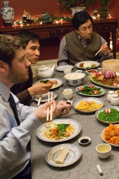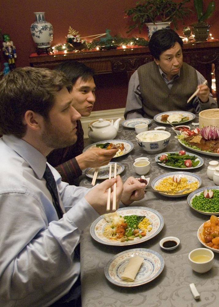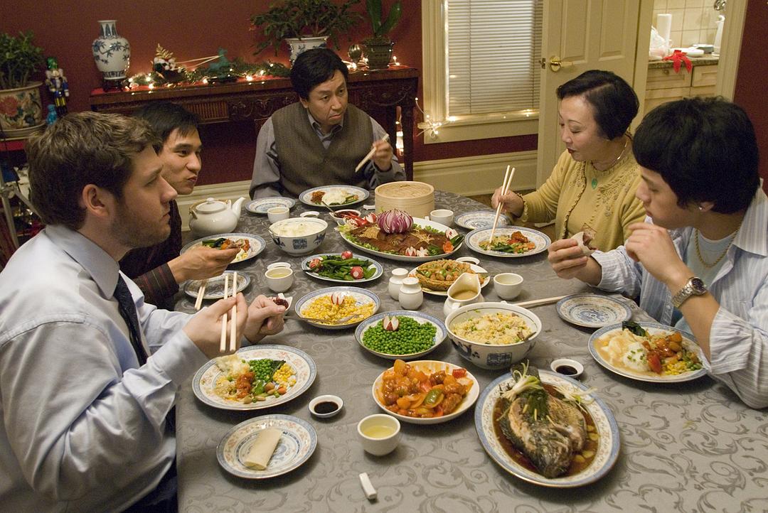 说这是一部向李安致敬的作品毫不为过,《饮食男女》里李安用精美的东方饮食慢火烹调出家庭伦理的冲突,《北京烤鸡》则搩取了一个旅美华人家庭圣诞晚餐的片段,通过大儿子带法国男友回家过节和求婚,与思想老旧的父母产生戏剧冲突,从而给同性恋的父母认同问题注入了独特的东西方元素。整个晚宴处处“杀机四伏”又每每峰回路转。最后百般刁难的中国老父被儿子热情的法国男友一把搂住,那刻的表情既无奈又好笑,也未尝不带有一点欣慰。
