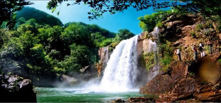 高80余米,似一股飞流从天而落。这里的峭壁山体呈90度直角,不但陡峻,而且整个山体由一块石头构成,中间没有断层。河水从悬崖峭壁上跌落,又被石壁撞击,如天女散花,似雨似雾,阳光照耀的时刻,不时有条条彩虹自此横跨天际,真是瀑上有瀑,令人神往。