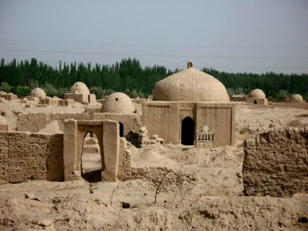 | 温宿古城古墓群 温宿古城古墓群是一片据传已有数百年历史的维吾尔古墓群。既有土垣环列的家族墓园,也有形单影只的孤冢坟丘;既有高大气派的墓门拱拜,而更多的是排列有序的平民坟茔。起伏错落的墓葬,绵延数平方千米。古墓群左侧有一条深达30余米的大裂谷。游人在这里可以了解到维吾尔族葬丧习俗,还可以通过观赏雕饰精巧造型别致的墓门、墓室外等,进一步了解到维吾尔族建筑、绘画等艺术风格。 |