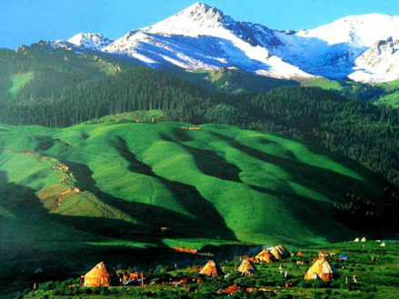 | 天山 天山是亚洲中部的一条大山脉,横贯中国新疆的中部,西端伸入哈萨克斯坦。长约2500千米,宽约250—300千米,平均海拔约5000米。最高峰是托木尔峰,海拔为7435.3米,汗腾格里峰海拔6995米,博格达峰的海拔5445米。这些高峰都在中国境内。 |