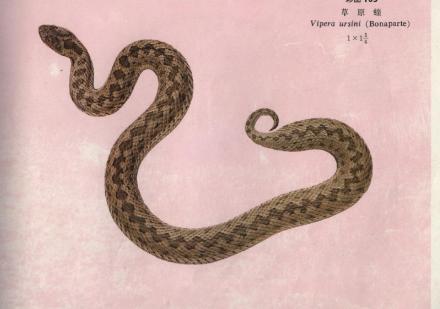 草原蝰(Vipera ursinii Bonaparte,1835),有鳞目蝰科。与极北蝰相似,但本种吻略窄,头背面除额鳞、顶鳞与眶上鳞为大鳞外,其余均为平滑小鳞。背面灰褐色,背脊有黑褐色纵纹,腹面黑褐色。见于北疆地区草原,以小型动物为食。卵胎生。