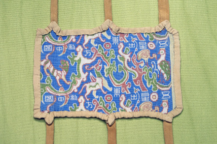 该织锦呈圆角长方形,长18.5厘米,宽12.5厘米,用“五星出东方利中国”织锦为面料,边上用白绢镶边,两个长边上各缝缀有3条长约21厘米、宽1.5厘米的白色绢带,其中3条残断。织有八个篆体汉字:“五星出东方利中国”。