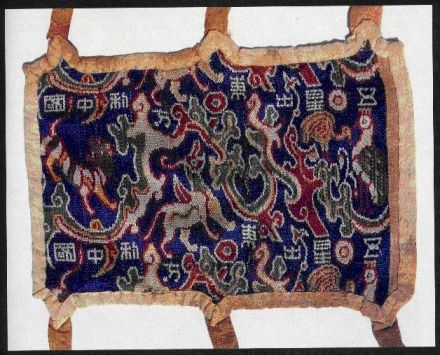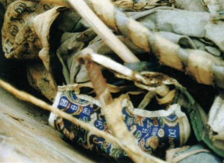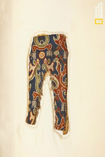 就在失望中,考古人员挖开了一座古墓。这是一个两人合葬墓。合葬的两人身上穿着许多衣物,最显眼的是,其中一具尸体的右臂上绑着一个色彩鲜艳的织锦。织锦色彩绚烂,文字激扬,纹样诡秘,意蕴神奇,立刻吸引了所有人的眼光。