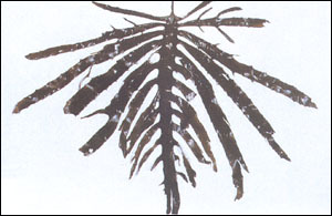 3.中国裙带菜可分为两型:北海型(formadistansMiyabeetOkam)藻体较为细长,羽状裂缺接近中肋,孢子叶距叶部有相当的距离。生长在大连、山东沿海。南海型(formatypicaYendo)恰好相反,即体形较短,羽状裂缺较浅,孢子叶接近叶部。浙江嵊泗列岛海域自然生长,即属此型。