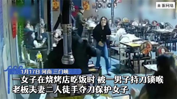 近日有网友发视频称在吃饭的时候遇到一女子被人持刀锁喉,店老板夫妻二人徒手夺刀勇救女子,引发网友关注。