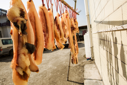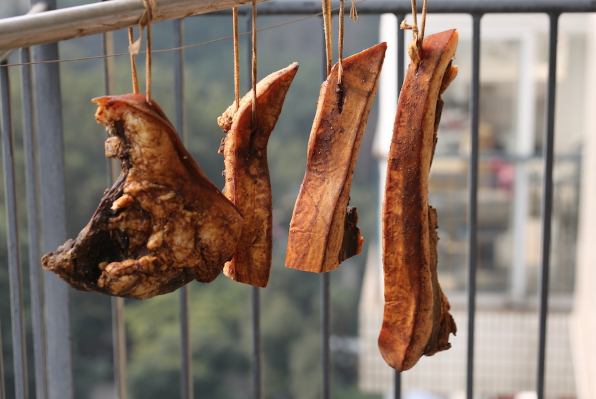 冬至之后,人们就会开始为过冬、过年腌制腊肉了,有的地方还会在给腊肉进行烟熏,更增风味。腌制腊肉的时候需要加入食盐、酒、酱油等等调料脱水、入味,经过长时间的烘烤、晾晒、烟熏等,制出来的腊肉非常好吃。腊肉一
