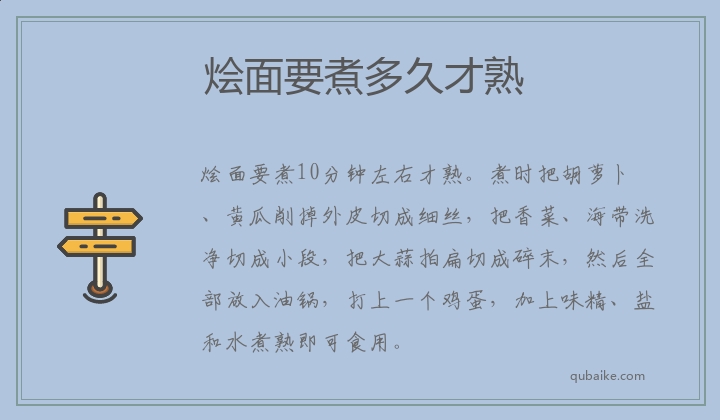 烩面要煮10分钟左右才熟。煮时把胡萝卜、黄瓜削掉外皮切成细丝,把香菜、海带洗净切成小段,把大蒜拍扁切成碎末,然后全部放入油锅,打上一个鸡蛋,加上味精、盐和水煮熟即可食用。