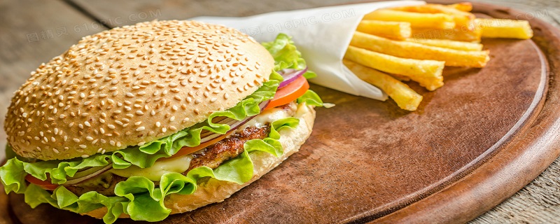 汉堡是由两片小圆面包夹一块牛肉饼组成,现代汉堡中除夹牛肉饼或其它肉饼(只要是煎或炸的)外,还在圆面包的第二层中涂以黄油、芥末、番茄酱、沙拉酱等,再夹入番茄片、洋葱、