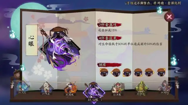原版心眼的效果是「对生命值低于30%的单位造成额外50%的伤害」。可惜游戏早期针女和破势表现太过于亮眼,而且退一步讲只要式神残血哪怕不佩戴心眼基本所有输出式神都能收割,这使得心眼处境尴尬。后来随着加强。