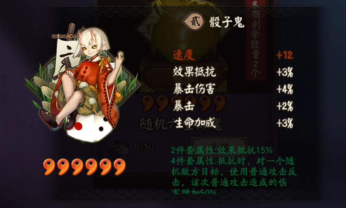 御魂骰子鬼是《阴阳师》中的辅助加成类御魂,刚出的骰子鬼不会锁定来源,只能用更高伤害的普攻反击随机单位。加强后,才慢慢为更多式神所佩戴。加强原先骰子鬼不会锁定来源,也没有增加行动条的效果,只是单纯的用更。