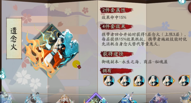 御魂遗念火是《阴阳师》中的效果命中攻击加成类御魂,原型来自日本冲绳地区,人们将亡灵称作“遗念”,遗念火总是出现在固定的地方,并且是成双成对的出现。属性效果两件套属性:效果命中15%四件套效果:携带者回。