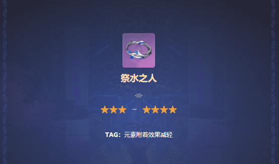 原神作为一款非常受欢迎的手机游戏,很多小伙伴都想要知道祭水之人圣遗物怎么获得,下面给大家介绍祭水之人圣遗物的获取方法,一起来了解一下。基础属性2件套 (套装仅一件)受到的水元素附着效果的持续。
