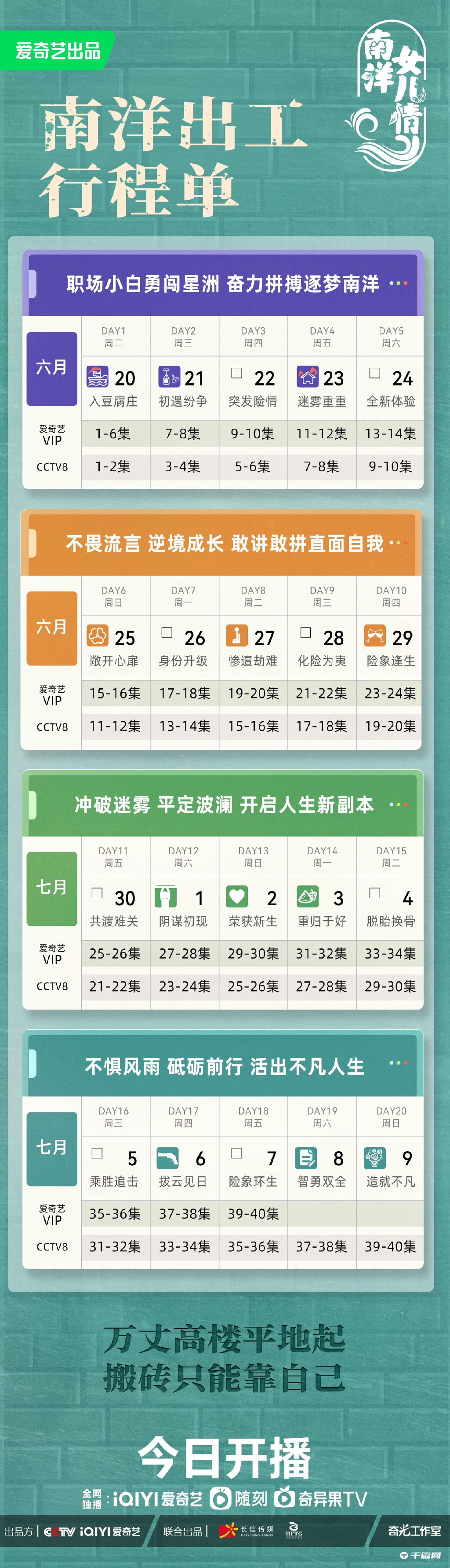 电视剧《南洋女儿情》追剧日历:共40集。6月20日(今晚)起CCTV8黄金强档每晚7:30两集连播,7月9日播出最后两集。爱奇艺网络独播,会员每晚7:30更新2集,且始终抢先央八多看4集、首更6集。会。