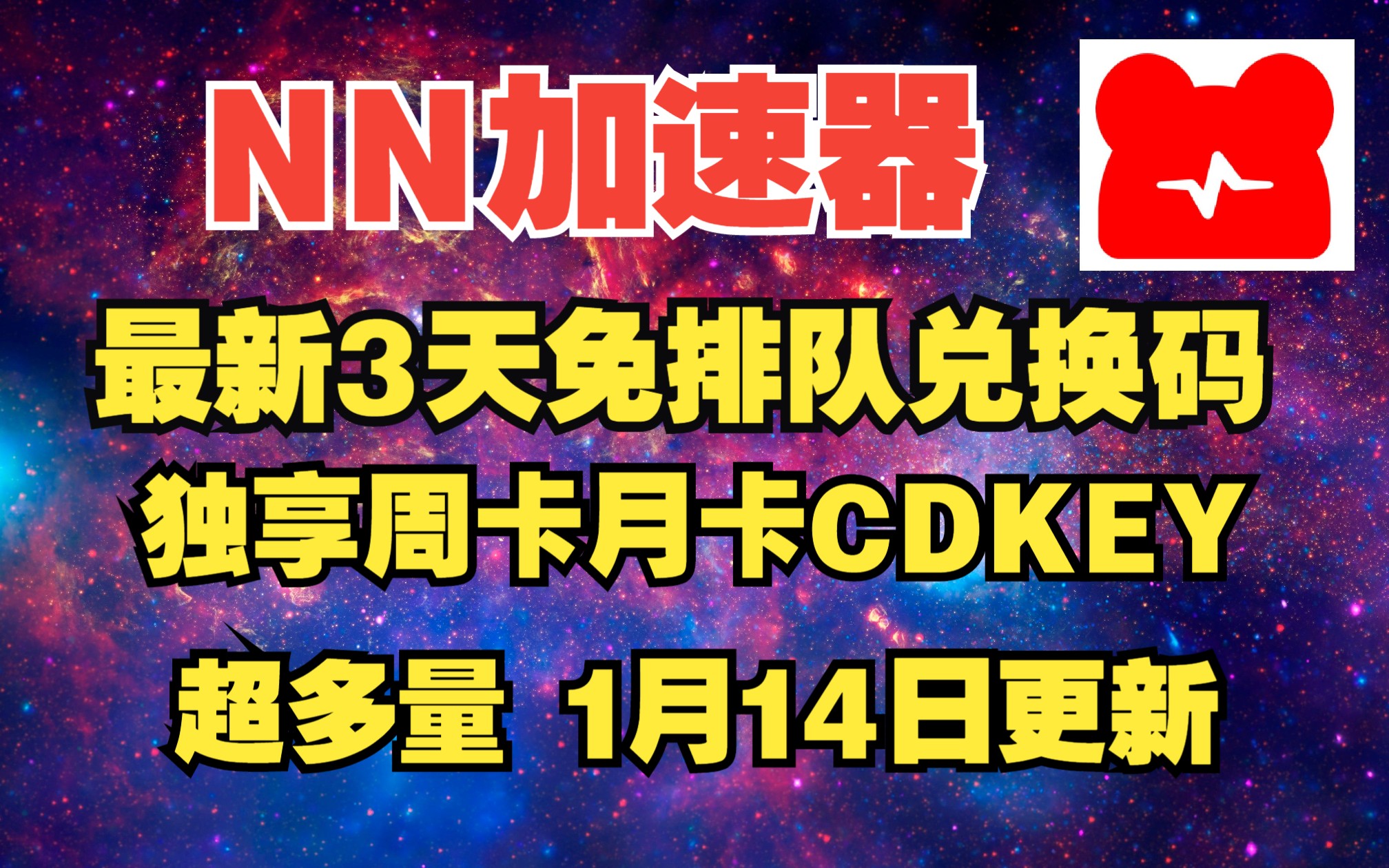《NN加速器》2023年1月14日最新主播兑换码+周卡CDKEY,谁先抢到就是谁的,最新3天免排队兑换码,还有周卡CDK口令可以兑换使用,兑换后秒到到自己账户。文章下方还有更多游戏加速器兑换等你来使用。