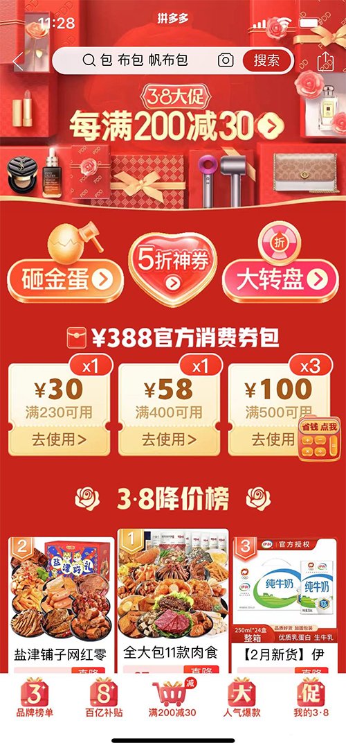 拼多多上半年第一场全网大促3·8大促已开启啦,《拼多多》38节有满减吗?活动力度大吗?接下来就一起来看看吧。拼多多3.8节:每满200减305折神卷砸金蛋活动大转盘活动还可以领取388官方消费卷包。