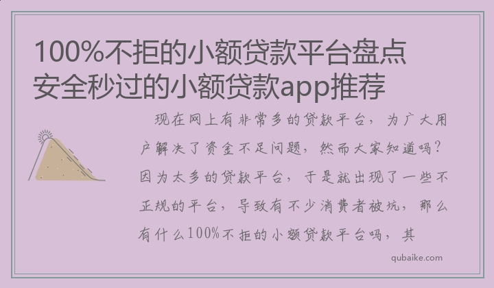 现在网上有非常多的贷款平台,为广大用户解决了资金不足问题,然而大家知道吗?因为太多的贷款平台,于是就出现了一些不正规的平台,导致有不少消费者被坑,那么有什么100%不拒的小额贷款平台吗,其实100%不