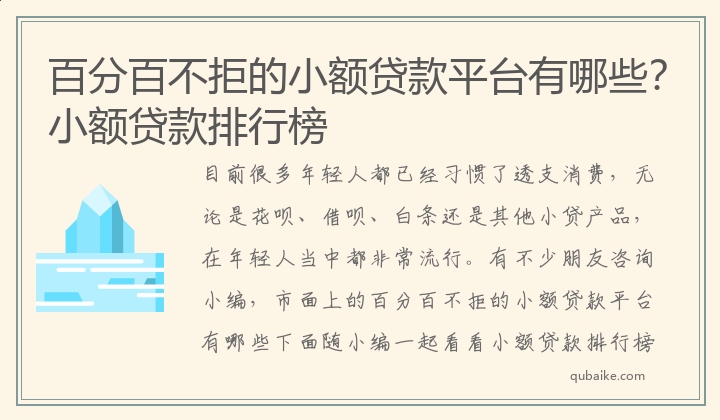 目前很多年轻人都已经习惯了透支消费,无论是花呗、借呗、白条还是其他小贷产品,在年轻人当中都非常流行。有不少朋友咨询小编,市面上的百分百不拒的小额贷款平台有哪些下面随小编一起看看小额贷款排行榜吧!