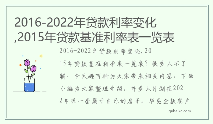 2016-2022年贷款利率变化,2015年贷款基准利率表一览表?很多人不了解,今天趣百科为大家带来相关内容,下面小编为大家整理介绍。许多人计划在2022年买一套属于自己的房子。毕竟全款客户还是比较。