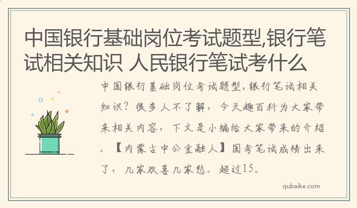 中国银行基础岗位考试题型,银行笔试相关知识?很多人不了解,今天趣百科为大家带来相关内容,下文是小编给大家带来的介绍。【内蒙古中公金融人】国考笔试成绩出来了,几家欢喜几家愁。超过15。