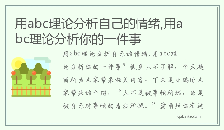 用abc理论分析自己的情绪,用abc理论分析你的一件事?很多人不了解,今天趣百科为大家带来相关内容,下文是小编给大家带来的介绍。“人不是被事物所扰,而是被自己对事物的看法所扰。”爱丽丝你有这样。