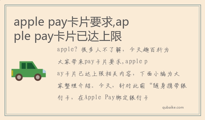 apple?很多人不了解,今天趣百科为大家带来pay卡片要求,apple pay卡片已达上限相关内容,下面小编为大家整理介绍。今天,针对此前“随身携带银行卡,在Apple Pay绑定银行卡。