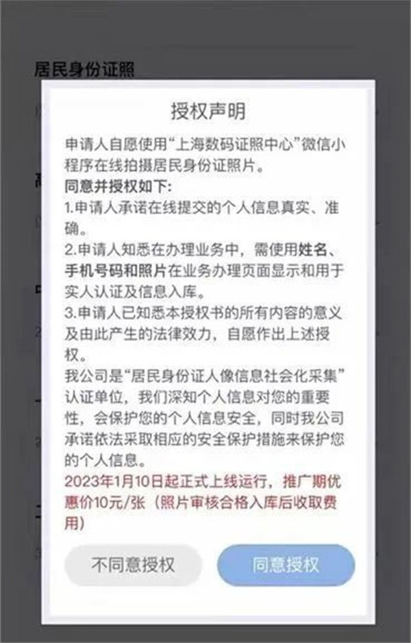 2023年1月,上海浦东分局人口管理办公室推出了“手机自助拍摄身份证照片”的便民服务政策,在小程序授权的声明中显示,推广期一张照片的优惠价格是10元/张,在照片审核合格后收取费用,但是在拍摄照片时,除了