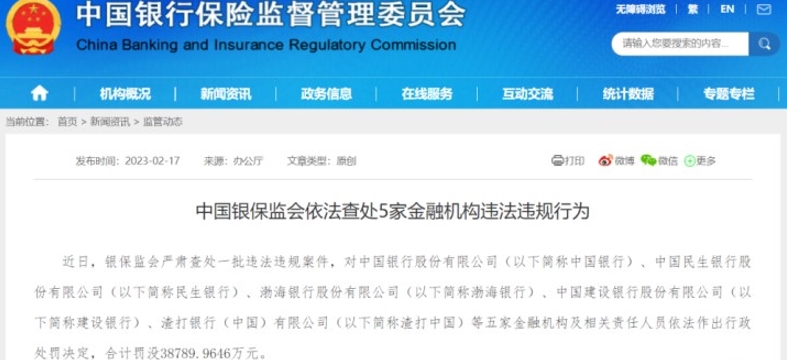 近日,中国银保监会发布消息,对中国银行股份有限公司、中国民生银行股份有限公司、渤海银行股份有限公司、中国建设银行股份有限公司、渣打银行(中国)有限公司五家金融机构开展的风险管理及内部控制有效性现场检查中