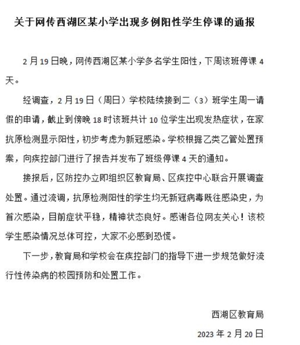 2月20日浙江省杭州市西湖区教育局发布《关于西湖区某小学停课的通知报告》经调查;2月19日学校陆续受到一班级学生请假的报告申请,截止到傍晚该班级累计10名学生出现发热症状,经抗原测试显示阳性,初步诊断为