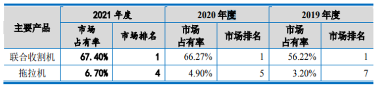 2019年至2022年6月末,沃得农机核心产品联合收割机销售数量分别为34,043 台、48,222台、61,513台和22,445台,2019年、2020年和2021年履带式收割机的国内市场占有率分别为 56.22%、66.27%和67.40%,连续三年市场占有率排名第一,在收割机领域雄据国内的龙头地位;2019年、2020年、2021和2022年1-6月,核心产品拖拉机销售数量分别为10,166台、21,648台、28,252台和21,497台,2019年、2020 年和2021年市场占有率分别为3.20%、4.90%和6.70%,拖拉机市占率逐年提高,处于行业前列,具体情况如下: