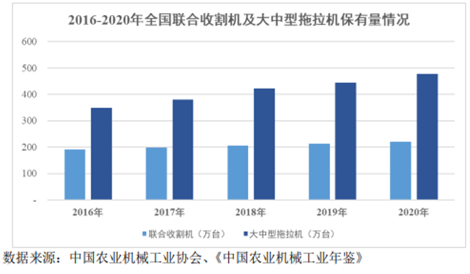 二是农机补贴政策推进农业机械化发展,农机保有量稳步增长。十几年来,国家先后出台农机购置补贴等多项扶持政策,支持农业生产向机械化方向发展,促进包括联合收割机、拖拉机在内的大型农业机械保有量持续增加。截至2020年末,我国谷物联合收割机保有量达到219.51万台,较2019 年增长3.13%;大中型拖拉机保有量477.28万台,较上年度增长7.53%,未来几年预估仍将保持稳步小增之势。