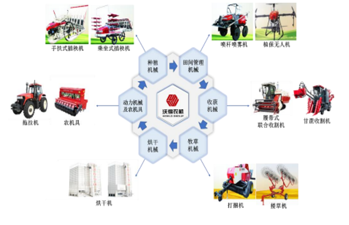 招股书显示,沃得农机是国内领先的大型现代化农业机械装备制造商,主要从事农业机械产品的研发、生产和销售,致力于为客户提供现代农业全程机械化的专业机械装备。公司产品畅销印度尼西亚、缅甸、厄瓜多尔、印度、孟加拉国、哥伦比亚、泰国、秘鲁等 39 个国家和地区,逐步构建在全球范围内具有竞争力的农业机械制造企业。目前,沃得农机已形成以联合收割机、拖拉机为核心,以插秧机、打捆机、甘蔗机、植保无人机、喷雾机、烘干机等为组合的产品矩阵。截至2022年末,沃得农机与经销商及第三方服务机构运营的客户服务中心共计500多家,公司配备100多辆流动服务车,服务范围覆盖全国28个省、直辖市和自治区。下图为沃得农机产品系列: