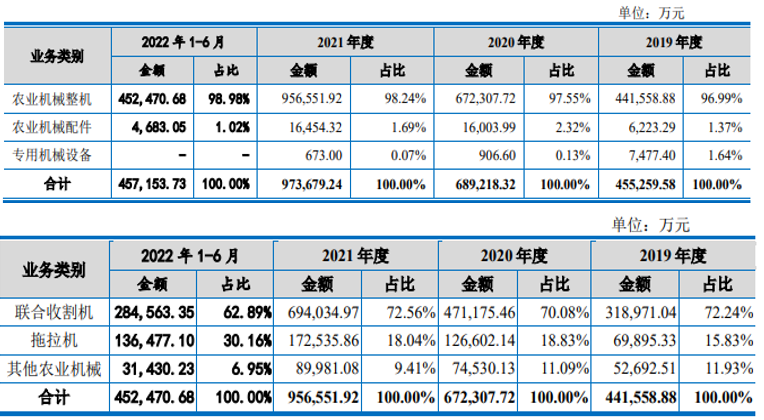 2019年至2022年6月,沃得农机主营业务收入的构成情况具体如下: