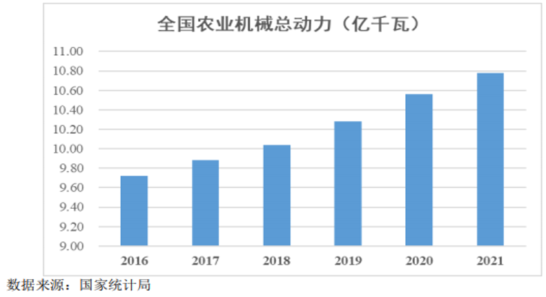一是农业机械总动力稳步增长。近年来,我国农业机械总动力持续增长,2021年度达到10.78亿千瓦,同比增长2.08%,未来几年仍将保持稳步小增。