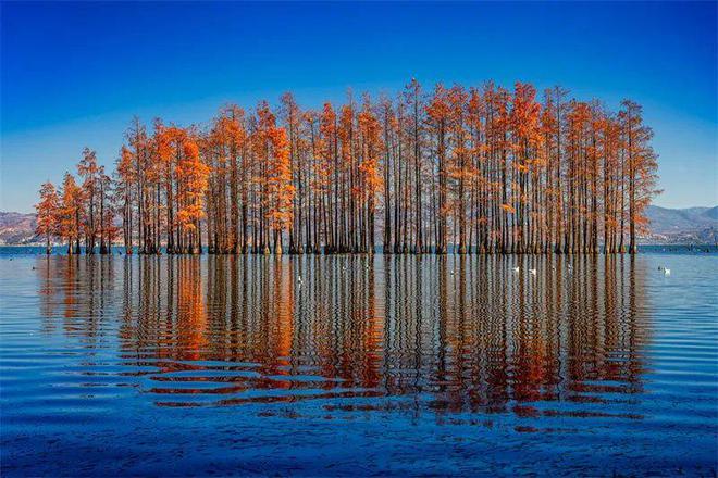 长达129公里的生态廊道旁,每年秋末冬初,水杉红透,倒影重重。去到大理最佳爱情表白地打卡点之一的龙龛古渡,等风吹过洱海,看洱海边娇艳似火的红杉美成画卷的样子,漫天彩霞和落日把苍山洱海染红,这里,是属于大理的秋日浪漫。