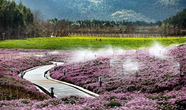 特别是花海,花海中间有个山包,两边一边是七彩花海一边是爱情花海,有一个爬山栈道可以爬上山上的最高点,可以俯瞰整个景区,另外城里万峰林也可以看到,这个地方视野比较开阔,另外上边我们爱情花海的造型是个心形的,上边看起来图案也是很别致的。三月在景区内可看到十里桃花盛开的场景,腊月则又可以看到梅花的身影,可谓是四季皆有景,景景都不同。