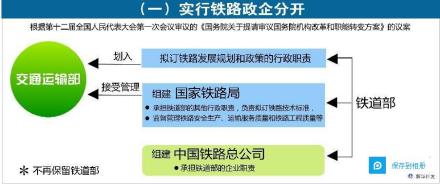 (一)实行铁路政企分开。为推动铁路建设和运营健康可持续发展,保障铁路运营秩序和安全,促进各种交通运输方式相互衔接,实行铁路政企分开,完善综合交通运输体系。将铁道部拟订铁路发展规划和政策的行政职责划入交通运输部。交通运输部统筹规划铁路、公路、水路、民航发展,加快推进综合交通运输体系建设。组建国家铁路局,由交通运输部管理,承担铁道部的其他行政职责,负责拟订铁路技术标准,监督管理铁路安全生产、运输服务质量和铁路工程质量等。组建中国铁路总公司,承担铁道部的企业职责,负责铁路运输统一调度指挥,经营铁路客货运输业务,承担专运、特运任务,负责铁路建设,承担铁路安全生产主体责任等。
