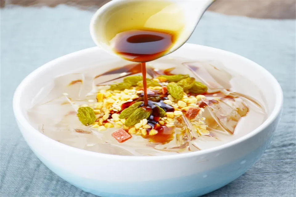 50克冰粉粉加入1000~1500ml清水,比例为冰粉粉粉:水=1:20~30,可以根据口感适当增减用量。