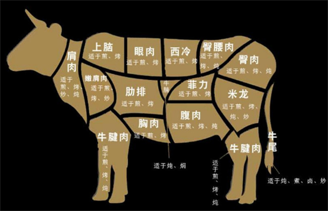 国外的牛肉进口到中国是需要进行详细的划分与标注的,一整头牛身上所可以食用的部位,都需要进行详细的分类。其中分为牛前腱,牛后腱,牛大米龙,牛小米龙,牛腩,牛上脑,牛肋排,牛西冷,牛,今天见牛尾牛腩筋,牛板筋,牛百叶,牛肚。当然其他像猪肉,鸡肉等都需要进行严格详细的划分与标注。