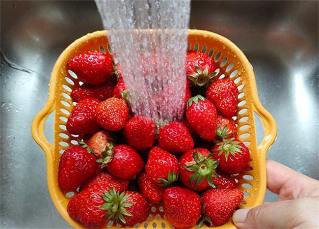 在清洗草莓前一定要注意,不要将草莓的果蒂拔掉,特别是其柄部的位置。如此一来可以防止其内部果肉与外界直接接触,细菌与农药残留渗入其中。接下来冲洗的过程当中,一定要注意选用流动水源,不要浸泡,浸泡也非常容易使附着在果肉表面的残留在水中飘荡,当取出水果时会二次附着于果面之上。清洗水果时一定要注意温柔一些,不要由于力气过大而造成草莓挤压破损,细菌与农药侵入果肉当中。