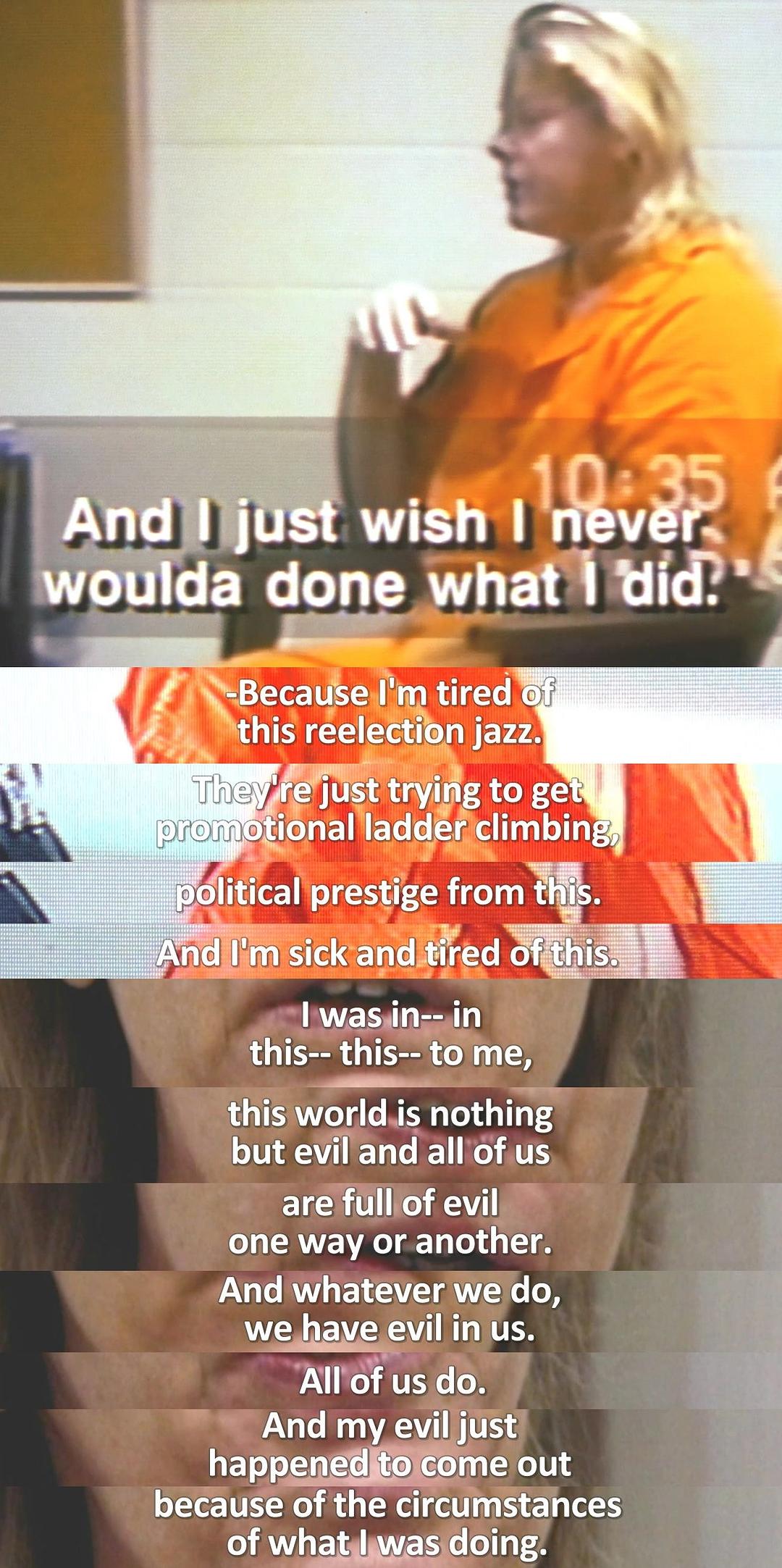 艾莲零二年十月接受死刑。但争拗多年来从未终止:精神病患者犯重罪应受死吗?妓女自卫杀人可原谅吗?连环女杀手是否更不得人同情?导演十二年来一直跟艾莲的案件,在纪录片中揭发惊人真相:囚犯认罪只因为厌倦了无止境的审讯,并深信死后会上天堂。这是一部深入精神病患者死囚脑海的纪录,重访她儿时成长的地方,走访她的朋友,尝试用历史的脈络追查她演变成连环杀手的历程。你可嗅到真实的死囚桐的气味,最震撼的不是烦人的盘问,而是女杀手静静坐下来细诉的温柔与激动。像她这样的一个女子,是如何走上喋杀七个男人的血光之途?