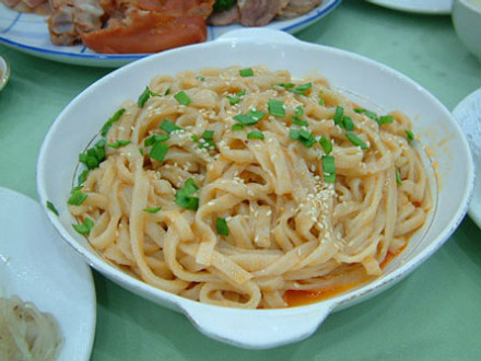 | 踅面 踅面为华阴独有,为当地人偏爱的风味小吃,称得上是最早的“方便面”,可即食,也可放置数日再食。制作方法:首先把荞麦拣净淘好,磨成细面。和面时用一根粗木棒顺同一方向搅拌,这是关键的一环,必须稀稠得当,搅拌均匀。面糊和得好,摊出的面才能好。摊面用的是铁鏊,重达40余斤,直径二尺多。舀一勺和好的面糊倒在鏊中心,用半月形的木踅子划开摊平,据说“踅面”即由此得名。烙到七八成熟,叠在一起,折成四折,用刀切成细丝。切好的面码在木箱在里备用。吃时把水烧开,放少许盐,踅面入锅,略一翻搅,或干捞,或带汤,调上大油、大油辣椒、清油辣椒、盐、醋、蘸一点花椒面,撒一点葱花或韭菜花,便可食用。 |