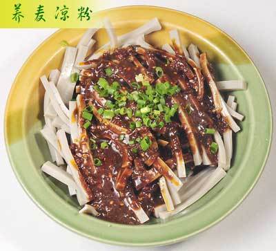 | 荞麦凉粉 华阴凉粉品种繁多,风味各异,制作考究,佐料独特。用荞麦制成的凉粉柔软滑爽,用豌豆制作的凉粉晶莹透亮,还有用扁豆、粉面等制作的凉粉。其中用养麦制作的凉粉工艺复杂,风味俱佳。荞麦凉粉是先把荞麦碾成荞珍子,去衣后,把荞珍子用手工碾成粉末,放在清水中浸泡,然后用马尾编织的细罗过滤,滤出的精华部分入锅用文火熬煮,熬成稀粥状后舀人盆中,冷却后逐渐变得软硬适宜时,即可食用。食用时,可削成长条形薄片,也可用专用的“捞捞”捞成长粉条状,盛入碗中,调入油泼辣子、芝麻酱、醋、酱油、芥末、蒜泥、精盐、花椒面等佐料,吃起来咸、酸、香、辣、鲜诸味俱全。特别在盛夏时节,一碗凉粉下肚,全身凉爽,暑气全消。在吃主食时,配以凉粉,往往使人食欲大增,胃口大开。 |
