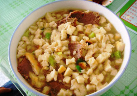 | 泡馍 牛羊肉泡馍,最早为西周礼馔,历史悠久。据史料记载,牛羊肉泡馍是在古代牛羊羹的基础上演变而成的。古代许多文献,如《礼记》以及先秦诸子,都曾提及牛羊肉羹。最初多用于祭祀及宫廷御筵。西周时曾将牛羊肉羹列为国王、诸侯的礼馔。《战国策》记载中山国君,由于一杯羊羹而激怒了司马子期,怒而走楚,说楚王伐中山,招致亡国的命运。《宋书》载:南北朝时,毛修之因向宋武帝献出羊羹,味美,武帝竟封俘虏修之为太官史,后又高升为尚书光禄大夫。到了隋朝,出现了“细供没忽羊羹”。此当为最初牛羊肉羹和面食混作的烹调形式。据文献记载,唐代宫廷御膳和市肆都擅长制羹汤。“三日入厨下,洗手作羹汤”。羊羹者,羊肉烹制的羹汤,即当今牛羊肉泡馍的雏形。 |