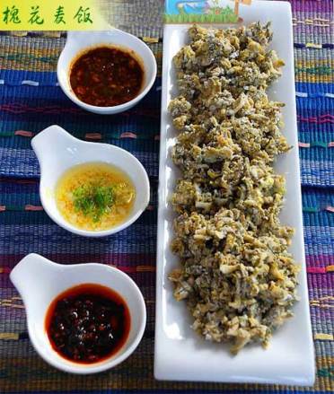 | 槐花麦饭 槐花“麦饭”,我们一般是把花序上的花朵摘下来、洗干净,用开水烫烫,将水分捏去,再拿专门的“擦子”把土豆擦成扁丝,把土豆丝和槐花放到盆子里,倒入适量面粉搅匀,上笼蒸20分钟左右,蒸好后,用调好的汁子(一般是蒜泥、辣子面、味精、葱花、酱油和醋放在碗里泼些油)拌着吃,味道好极了叫槐花洋芋“麦饭”。 |